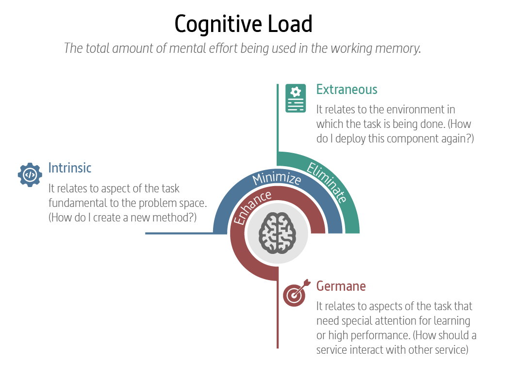 - Extraneous cognitive load: relates to the environment in which the task is being done (How do I deploy this component again?)