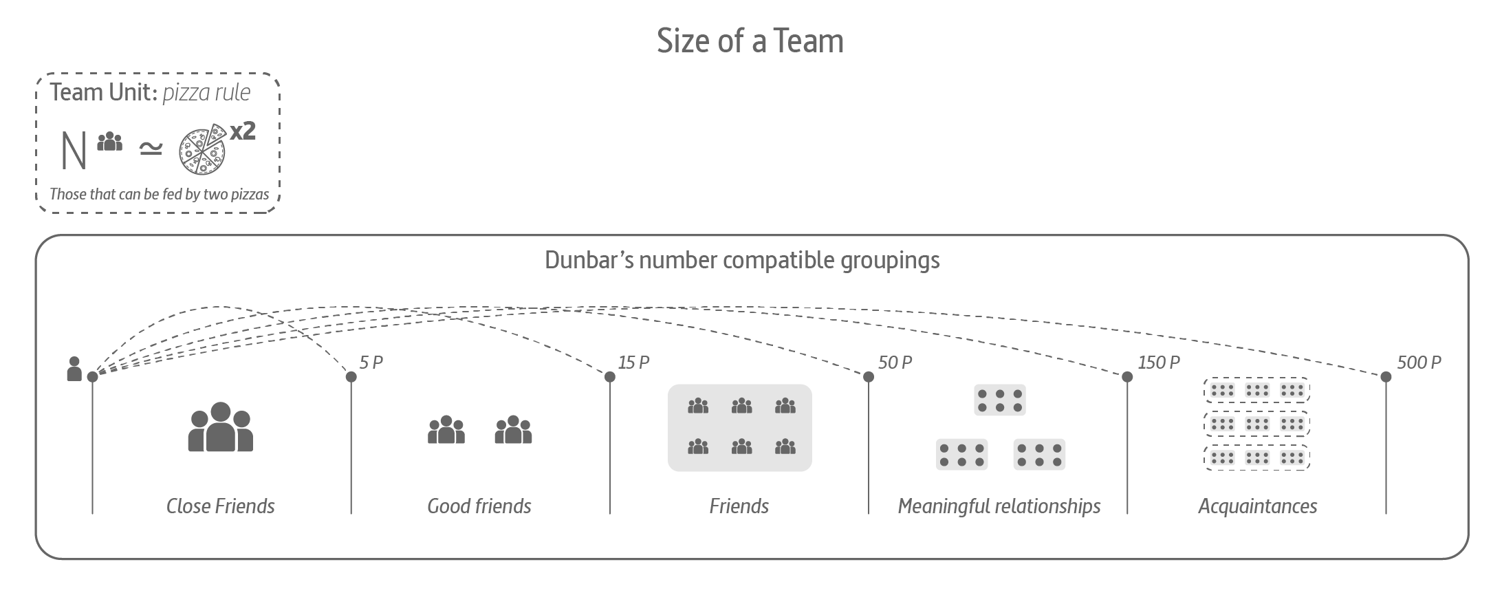 Amazon, for instance, is known for limiting the size of its software teams to those that can be fed by two pizzas. This limit, recommended by popular frameworks such as Scrum, derives from evolutionary limits on group recognition and trust known as Dunbar’s number (after anthropologist Robin Dunbar). Dunbar found fifteen to be the limit of the number of people one person can trust deeply. From those, only around five people can be known and trusted closely.