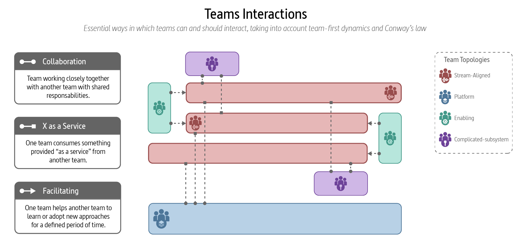 To understand how and when to adapt the Team Topologies model for software systems, we need to define and understand three essential ways in which teams can and should interact, taking into account team-first dynamics and Conway’s law.