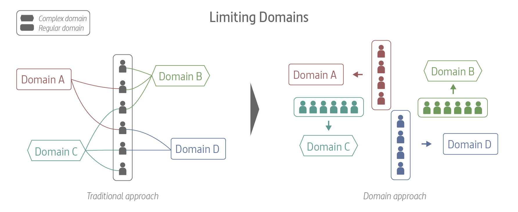 - The second heuristic is that a single team should be able to accommodate two to three “simple” domains. Because such domains are quite procedural, the cost of context switching between domains is more bearable, as responses are more mechanical.