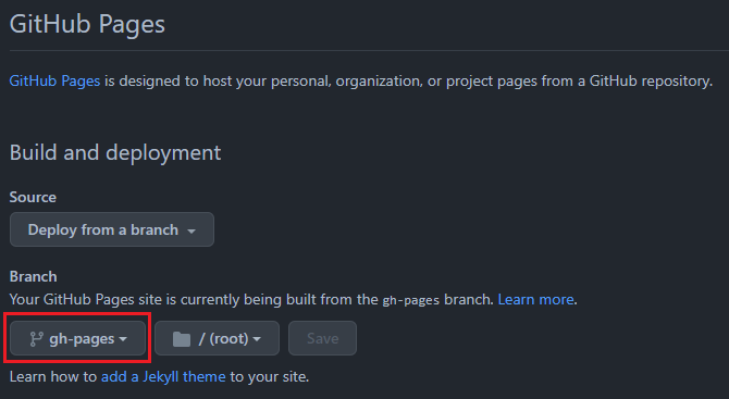 - Make sure pages is enable and select gh-pages as the site branch under Build and deployment section.