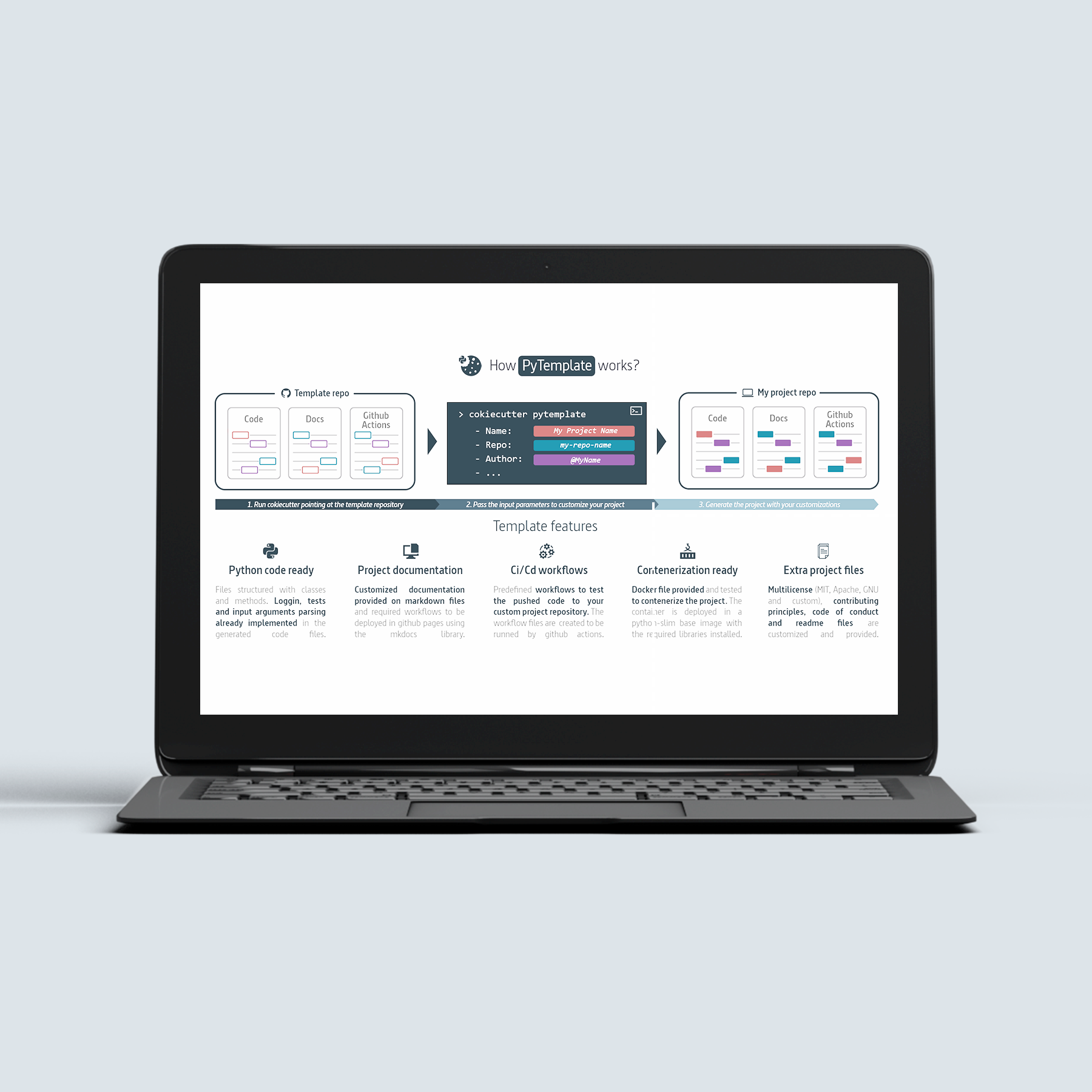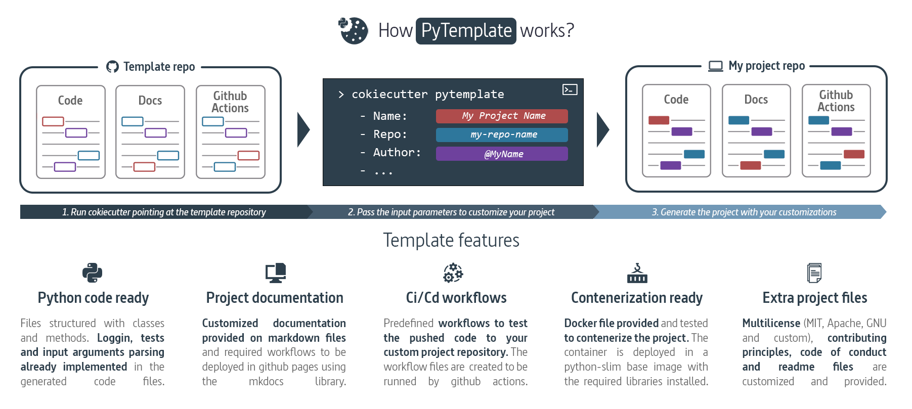 This is where PyTemplate comes into play. The template follows a customizable project structure using cookiecutter as the project generator. PyTemplate contains the usual files that a Python project needs, base code based on classes with an integrated logger and a Docker file to containerize your application. It also allows you to choose between multiple licenses and customize the documentation, deploying it on GitHub pages with GitHub workflows included in the template.