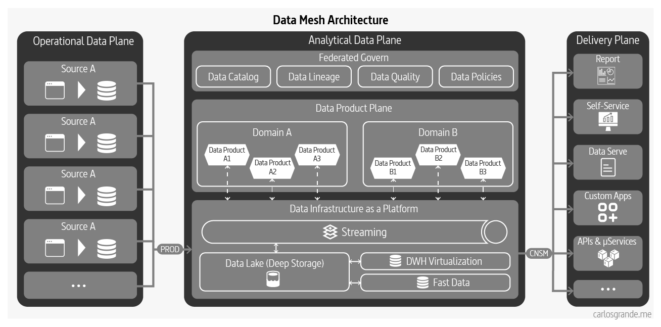 There are many applied Data Mesh architectures, some are more decentralized than others, and we have different tools and services. Even though there isn't a Data Mesh architecture itself, we can define and relate their main components.