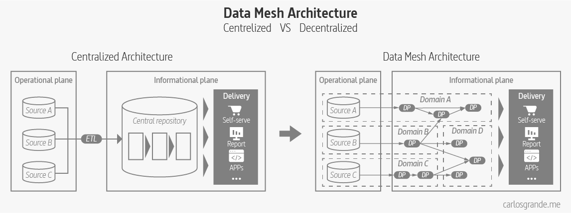 | Centralized custodianship of data | Federated custodianship of data by domains |