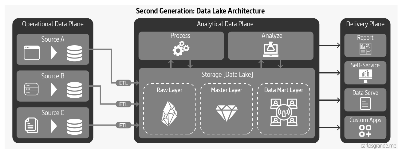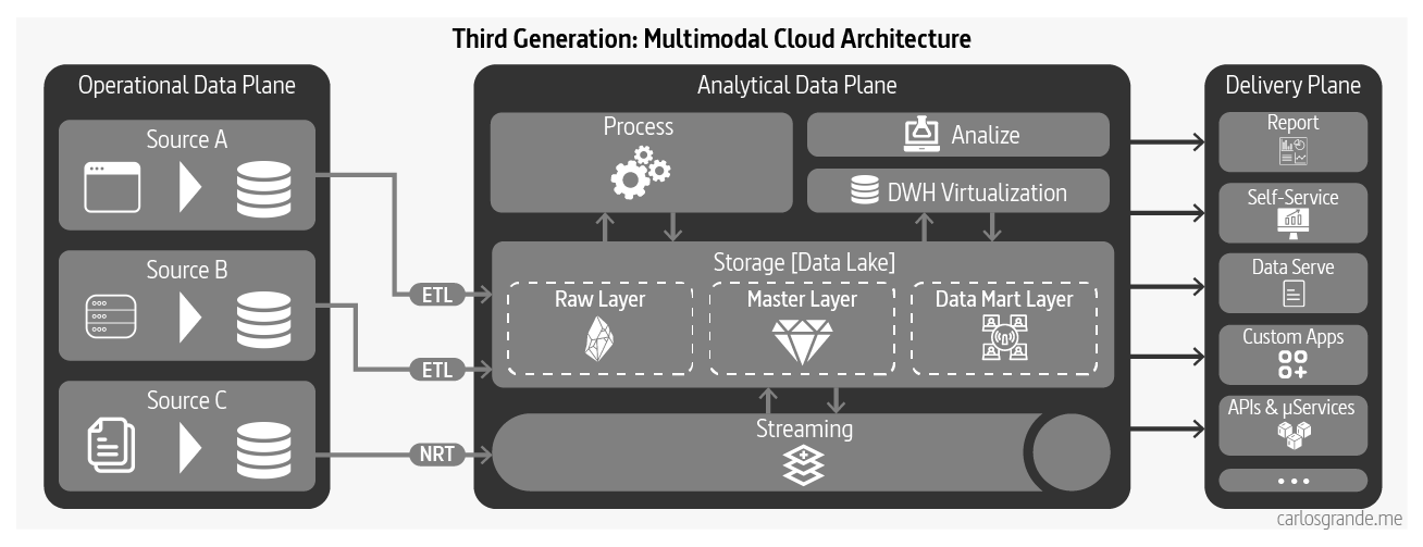 The third generation data platform is addressing some of the gaps of the previous generations such as real-time data analytics, as well as reducing the cost of managing big data infrastructure. However it suffers from many of the underlying characteristics that have led to the limitations of the previous generations. (Dehghani, 2022)