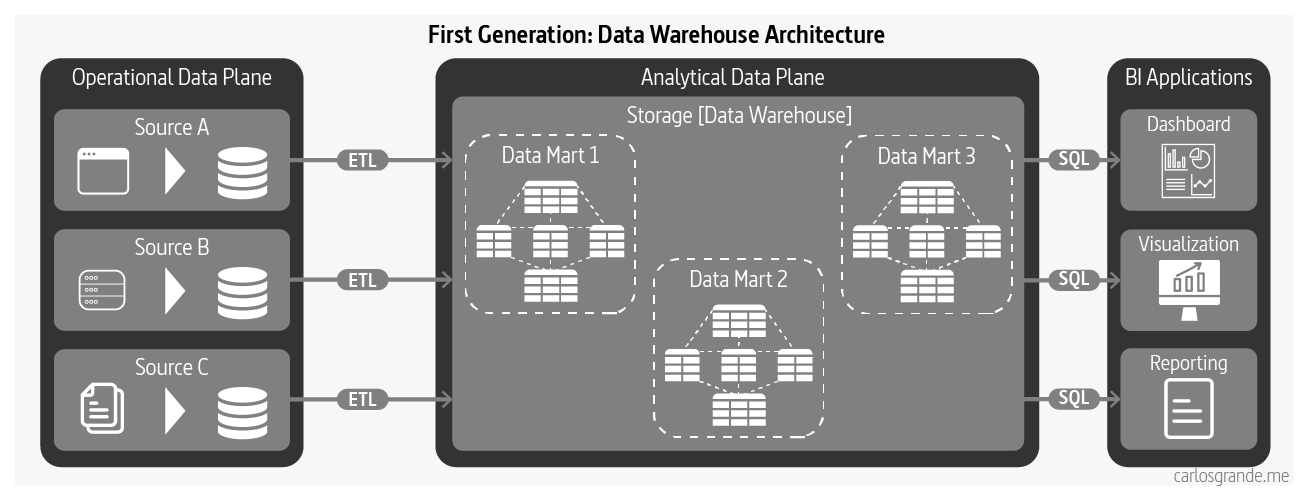 Data warehousing architecture today is influenced by early concepts such as facts and dimensions formulated in the 1960s. The architecture intends to flow data from operational systems to business intelligence systems that traditionally have served the management with operations and planning of an organization. While data warehousing solutions have greatly evolved, many of the original characteristics and assumptions of their architectural model remain the same. (Dehghani, 2022)