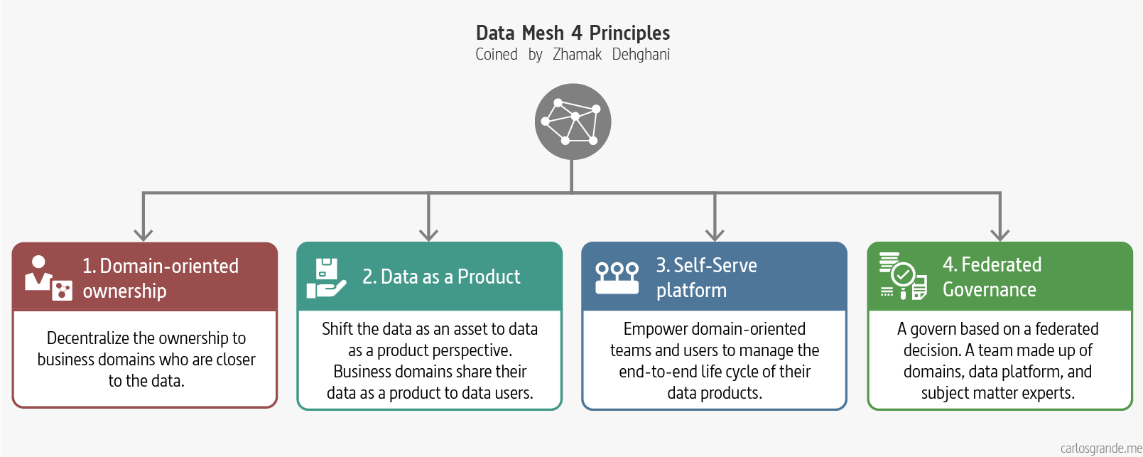 There are four principles that can capture what supports the logical architecture and operating model of Data Mesh.