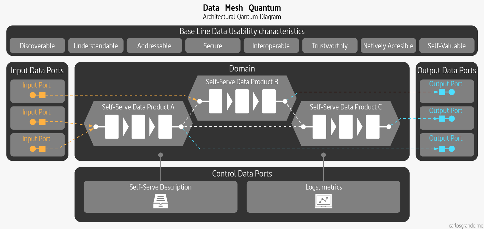 Existing or new business domains become accountable to share their data as a product served to data users – data analysts and data scientists. Data as a product introduces a new unit of logical architecture called, data product quantum, controlling and encapsulating all the structural components — data, code, policy and infrastructure dependencies — needed to share data as a product autonomously. (Dehghani, 2022)