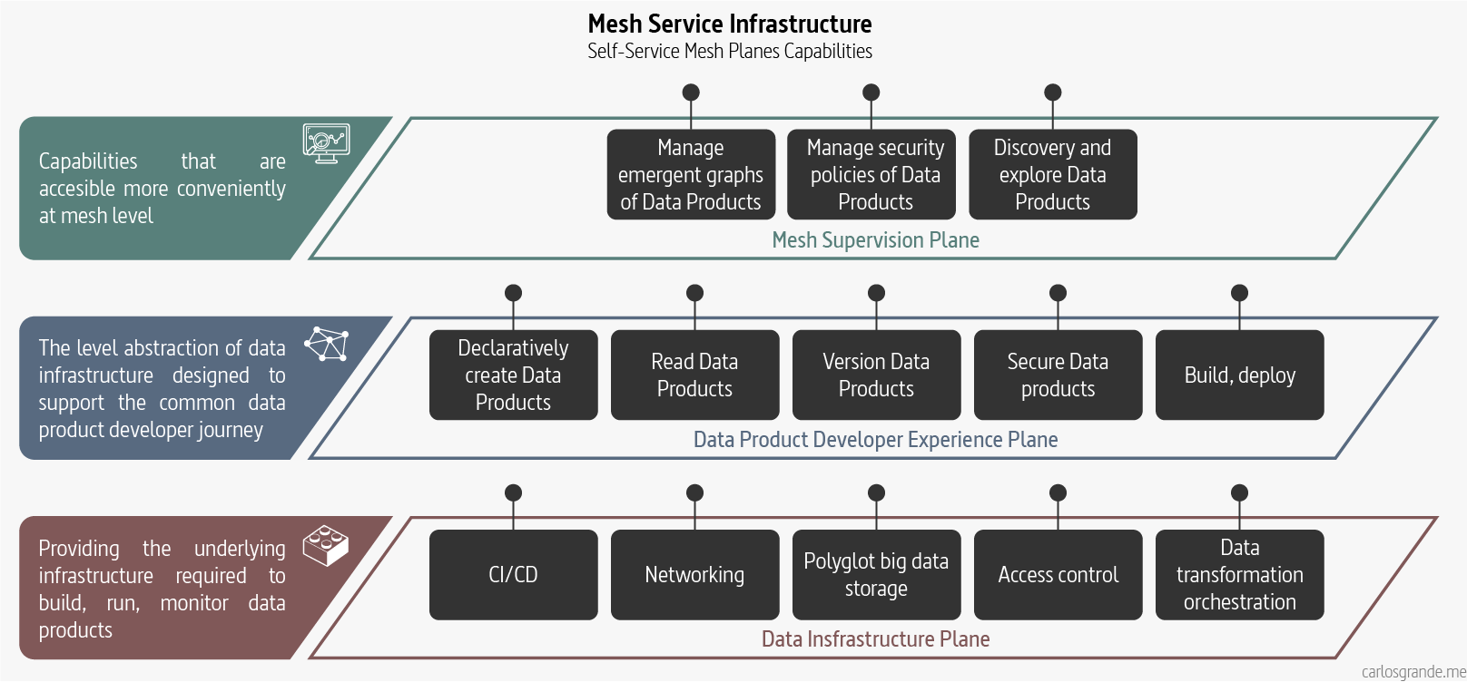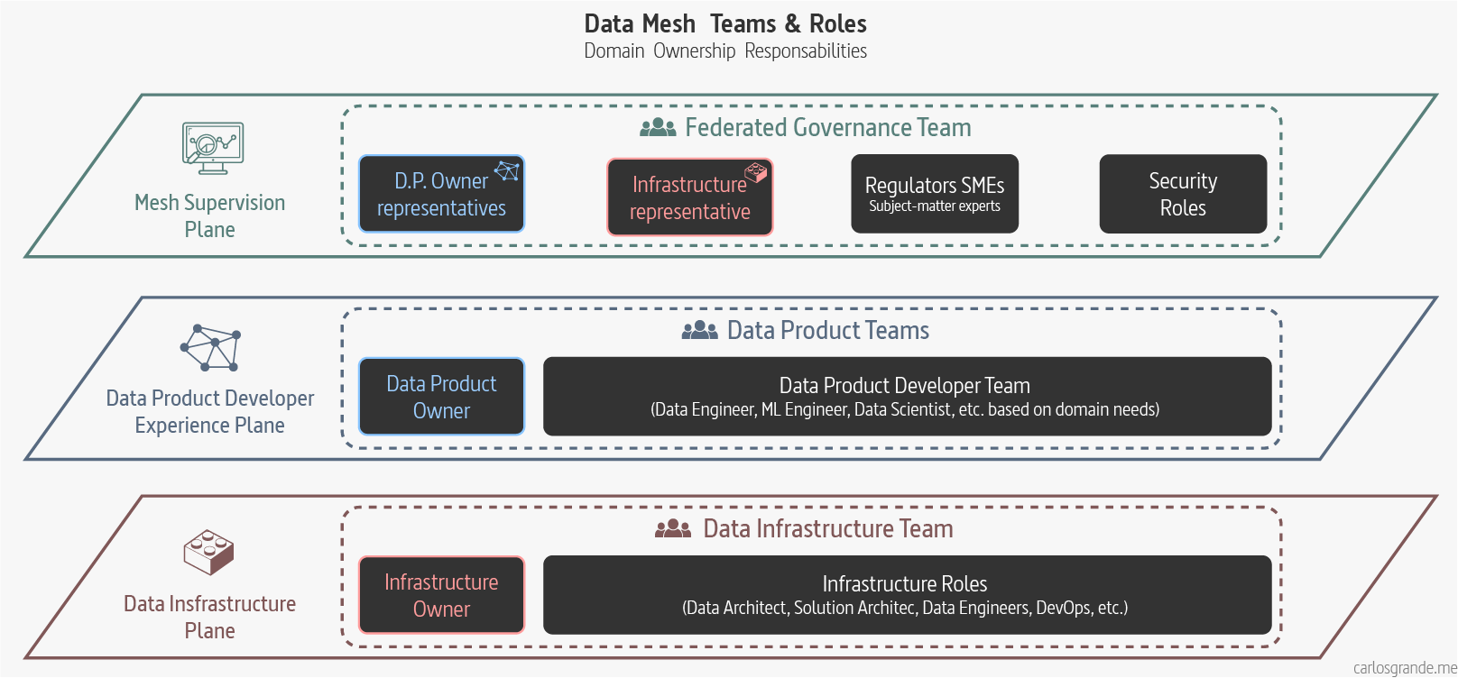 - Data infrastructure teams (located on the infrastructure plane): Providing the underliying infrastructure required to build, run and monitor data products.