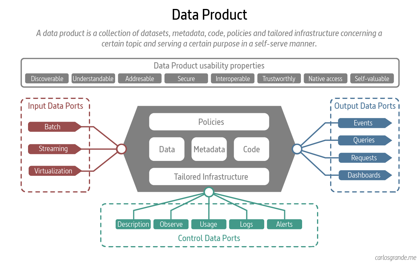 From an architectural point of view, we can divide a data product in five components: the product, the input ports, the control ports, the discovery ports, and the output ports.