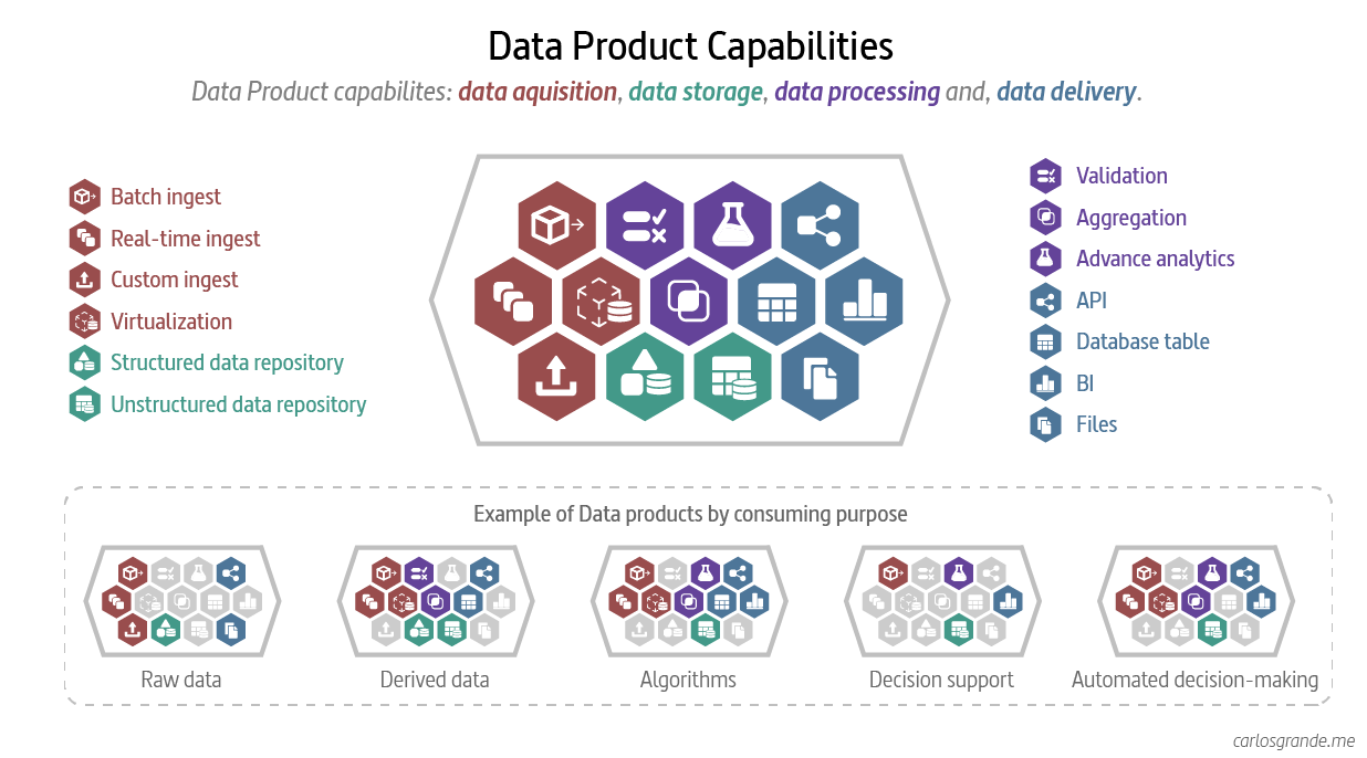 In my experience the best way to design a data product is through its capabilities. Data products, after all, are published to serve different use cases and therefore do not have a fixed structure. They can respond to batch, streaming, advanced analytics, reporting needs or even be a mix of the above.