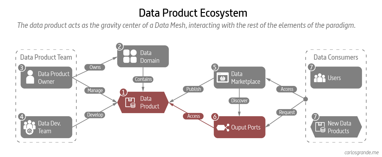 The data product (1) is the most important independent unit of the Data Mesh paradigm. To get a better understanding of what it means, we must comprehend the elements interacting within the Data Mesh ecosystem. Recall that a data product belongs within a domain (2) where we can find other data products (7). Besides, a data product is managed by a Data Product Owner (3) and maintained and developed by a data product developer team (4). It is common to find a team of developers across multiple domains and data products, but there should always be a single data product owner per domain.