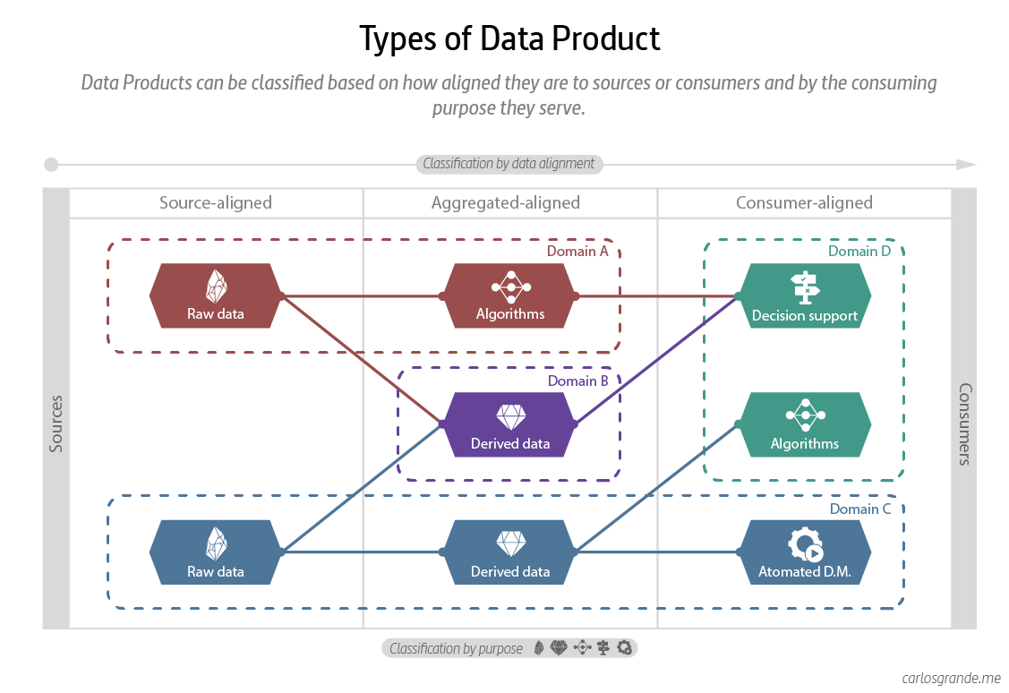 There isn't just one type of data product, as each data product may have different requirements and capabilities. We can classify them based on how aligned they are to consumption or origins and by the purpose they serve.
